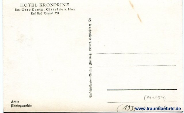 – Details – Jahr: ca. 1935 Status: ungelaufen Beschriftung vorne: Johanniskirche Gitterfelde am Harz Beschriftung hinten: Hotel Kronprinz, Bes. Otto Kaetz, Gitterfelde a. Harz, Ruf Bad Grund 224, Echte Photographie, Ansichtskarten-Verlag Zimmaß, Erfurt, Schließfach 770 Stempel: keine Hinweis: