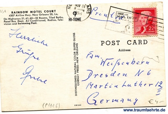 – Details – Jahr: ca. 1955 Status: gelaufen 1956 Beschriftung vorne: (Rainbow) Motel Court, Swimming Pool Beschriftung hinten: Rainbow Motel Court, 4307 Airline Hwy, New Orleans 20, La. On Highways 51, 61, 65 – 32 Rooms, Tiled Baths, Panel Ray Heat, Air Conditioned, Radios, Television and Swimming Pool. CP Hi-Tone, Distinguished Natural Color Super Gloss, Cornay Press – New Orleans, 28190 Stempel: (New Orleans), Nov 24, 8 30 p,. 1956, (L); shop and mail early --- Hinweis: