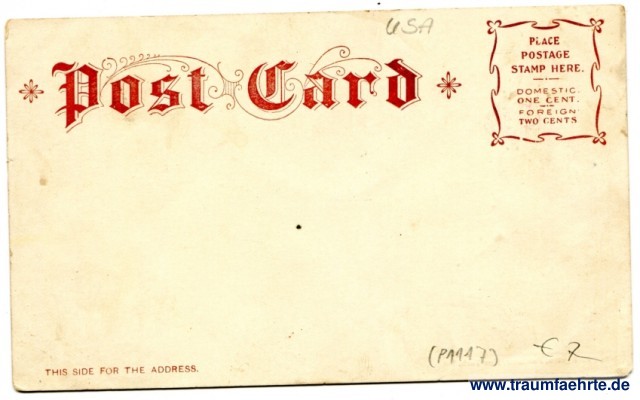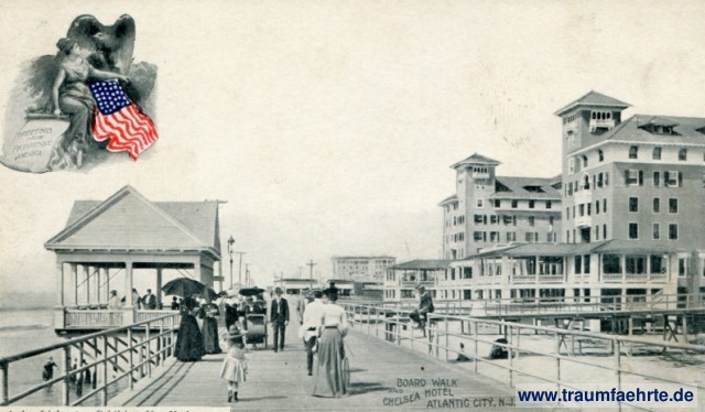 – Details – Jahr: ca. 1905 Status: ungelaufen Beschriftung vorne: Greetings from picturesque America, Board Walk and Chelsea Hotel, Atlantic City. N.J. Arthur Livingston, Publisher, New York. 109 Beschriftung hinten: Post Card, Place postage stamp here. Domestic. One cent. Foreign. Two cents, This side for the address. Stempel: keine Hinweis: