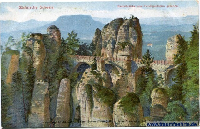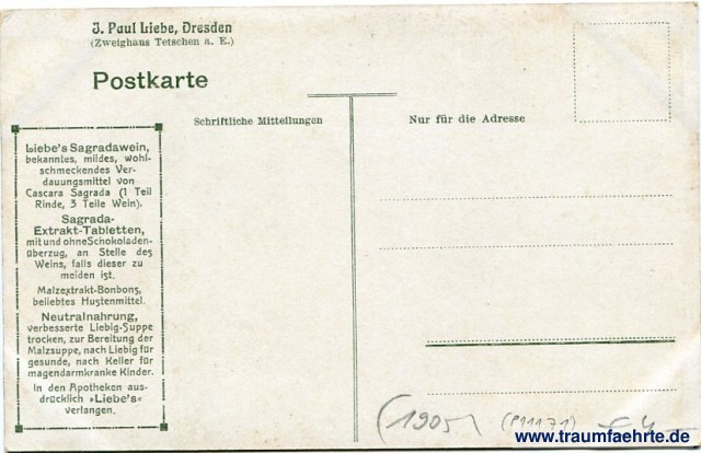 – Details – Year: ca. 1905 Postal state: postally unused Inscription front: Sächsische Schweiz. Basteibrücke vom Ferdinandstein gesehen. Erinnerung an die Sächs.-Böhm. Schweiz von J. Paul Liebe, Dresden u. Tetschen a. E. Inscription back: J. Paul Liebe, Dresden (Zweighaus Tetschen a.E.), Postkarte, Schriftliche Mitteilungen, Nur für die Adresse, Liebe's Sagradawein, bekanntes, mildes, wohlschmeckendes Verdauungsmittel von Cascara Sagrada (1 Teil Rinde, 3 Teile Wein). Sagrada-Extrakt-Tabletten, mit und ohne Schokoladenüberzug, an Stelle des Weins, falls dieser zu meiden ist. Malzextrakt-Bonbons, beliebtes Hustenmittel. Neutralnahrung, verbesserte Liebig-Suppe trocken, zur Bereitung der Malzsuppe, nach Liebig für gesunde, nach Keller für magendarmkranke Kinder. In den Apotheken ausdrücklich Liebe's verlangen. Postmark(s): none Please note: