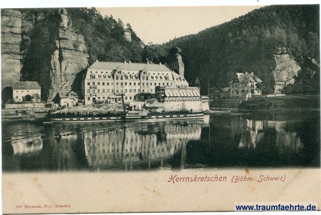 Ansichtskarte Mündung der Kamnitz/Kamenice in die Elbe/Labe in Herrnskretschen / Hřensko [ Permalink ]Schlagworte: Kamnitz, Elbe, Dampfschiffe, Brücken, Wald, Böhmische Schweiz, Böhmen, Sächsische Schweiz, Felsen, Sudetenland