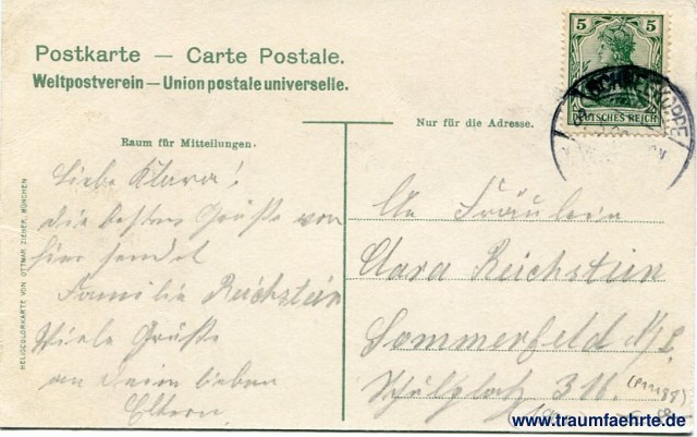 – Details – Year: ca. 1905 Postal state: postally used Inscription front: Schneekoppe mit Riesenbaude. Inscription back: Postkarte – Carte Postale. Weltpostverein – Union postale universelle. Raum für Mitteilungen, Nur für die Addresse, Heliocolorkarte von Ottmar Zieher, München Postmark(s): Schneekoppe, (...) Please note:
