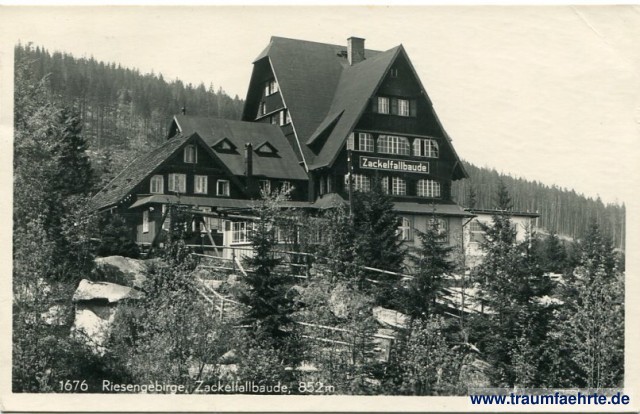 Ansichtskarte Zackelfallbaude / Schronisko Kamieńczyk in Schreiberhau / Szklarska Poręba [ Permalink ]Schlagworte: Riesengebirge, Ostgebiete, Schlesien, Berge, Wald, Bauden