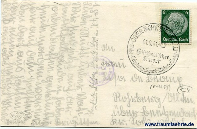 – Details – Jahr: ca. 1940 Status: gelaufen 1941 Beschriftung vorne: 1676 Riesengebirge, Zackelfallbaude, 852m Beschriftung hinten: Photowerkstätte Bruno Scholz, Görlitz, Schles., Blumenstr. 8 Stempel: Oberschreiberhau, Ruhe, Erholung, Sport, Unterhaltung, 01.8.41.-20, Heilklimatischer Kurort; Zackelfallbaude (...) Hinweis: