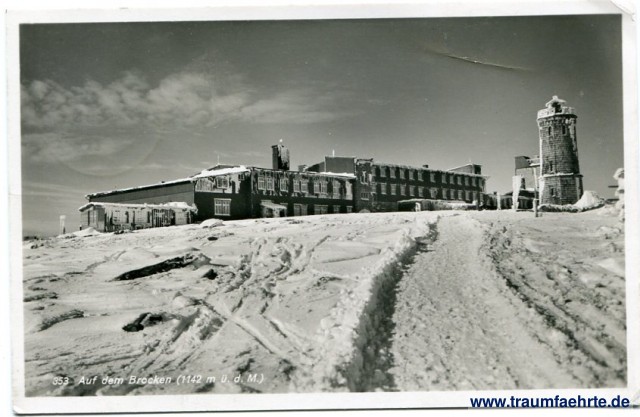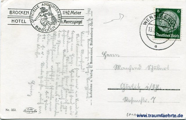 – Details – Jahr: ca. 1935 Status: gelaufen 1938 Beschriftung vorne: 353 Auf dem Brocken (1142 m ü. d. M.) Beschriftung hinten: Brocken Hotel, 1142 Meter ü. Meeresspiegel, Officielle Ansichtskarte Brocken, Nr. 353. Echte Photographie, Aufnahme u. Verlag U. Bornemann, Blankenburg – Harz. Stempel: Wernigerode, (e),, 13.3.38.-18 Hinweis: