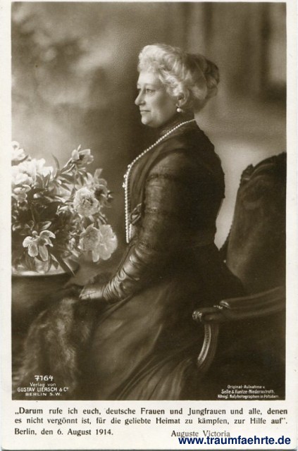 Inscription front: 7164 Verlag von Gustav Liersch & Co. Berlin S.W. Original-Aufnahme v. Selle & Kuntze-Niederastroth. Königl. Hofphotographen in Potsdam. Darum rufe ich euch, deutsche Frauen und Jungfrauen und alle, denen es nicht vergönnt ist, für die geliebte Heimat zu kämpfen, zur Hilfe auf. Berlin, 6. August 1914. Auguste Victoria