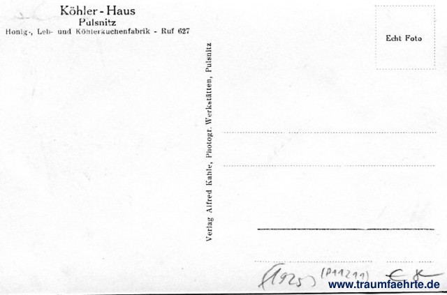 – Details – Jahr: ca. 1925 Status: ungelaufen Beschriftung vorne: 59205, Lebkuchenfabrik Richard Köhler, Köhler Haus, Gegr. 1896. Spez: Köhlerkuchen,... Beschriftung hinten: Köhler-Haus, Pulsnitz, Honig-, Leb- und Köhlerkuchenfabrik – Ruf 627, Verlag Alfred Kahle, Photogr. Werkstätten, Puslnitz, Echt Foto Stempel: keine Hinweis: