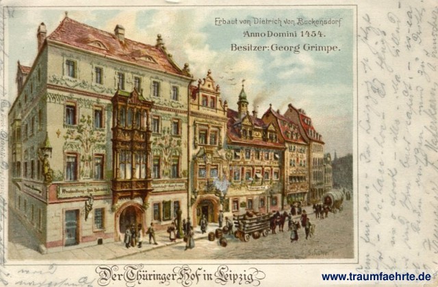 – Details – Year: ca. 1895 Postal state: postally used 1900 Inscription front: Der Thüringer Hof in Leipzig, Erbaut von Dietrich von Buckensdorf, Anno Domini 1454. Besitzer: Georg Grimpe. Inscription back: Postkarte, An ... in ... Wohnung (Straße und Hausnummer) ... Postmark(s): Leipzig, b 13 b, 25.8.00.9-10N; Brossburgk (Bz. Dresden), 27 8 00, 8-9V. Please note: