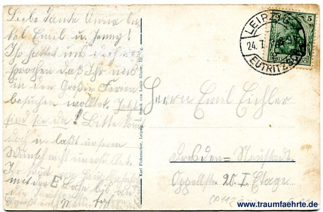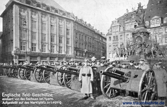 – Details – Jahr: 1915 Status: gelaufen 1915 Beschriftung vorne: Englische Feld-Geschütze, erobert von den Sachsen bei Ypern. Aufgestellt auf dem Marktplatz zu Leipzig. Paul Michaud, Dresdner-Hof (...), Baarmann,... Beschriftung hinten: Karl Fickeuscher, Leipzig. – Druck von Louis Glaser, Leipzig. Stempel: Leipzig-Eutritzsch, 24. 7. 15. 8-9V Hinweis:
