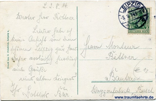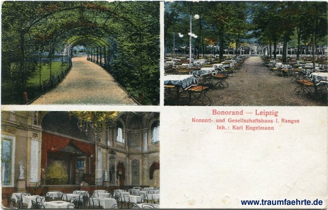 – Details – Jahr: ca. 1910 Status: gelaufen 1914 Beschriftung vorne: Bonorand – Leipzig, Konzert- und Gesellschaftshaus I. Ranges, Inh.: Karl Engelmann Beschriftung hinten: Druck von G. Friedrich, Leipzig 4. Stempel: Leipzig, (...) 3 a, -3. 9.14.9-10V Hinweis: