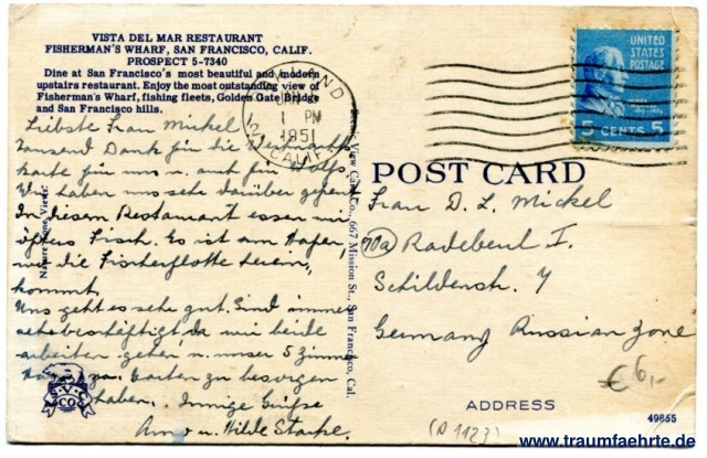 – Details – Year: ca. 1950 Postal state: postally used 1951 Inscription front: Marine View Dining Room, Vista Del Mar Restaurant, San Francisco, California. Inscription back: Post Card, Addres, Vista del Mar Restaurant, Fisherman's Wharf, San Francisco, Calif. Prospect 5-7340, Dine at San Francisco's most beautiful and modern upstairs restaurants. Enjoy the most outstanding view of Fischerman's Wharf, fishing fleets, Golden Gate Bridge and San Francisco hills. Scenic View Card Co., 667 Mission St., San Francisco, Cal. 49855, Nature Tone Views. S V C Co Postmark(s): Oakland, Jan 5, 1 pm, 1951, Calif. 2; ~~~ Please note:
