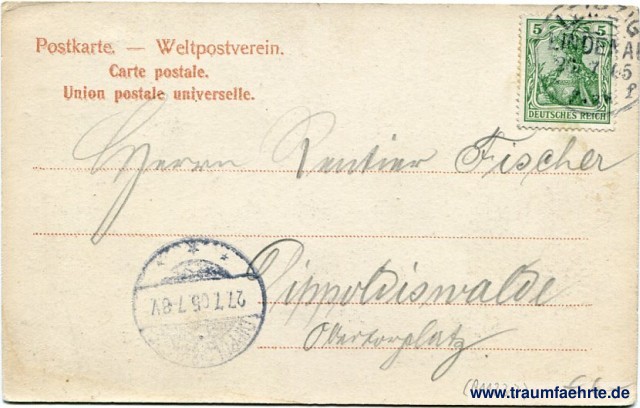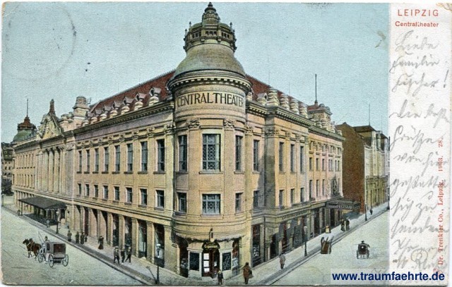 – Details – Year: 1903 Postal state: postally used 1905 Inscription front: Leipzig, Centraltheater, DRC, Dr. Trenkler Co., Leipzig. 1903. 28. Centraltheater, Cigarren, Grosser Festsaal,... Inscription back: Postkarte – Weltpostverein. Carte postale. Union postale universelle. Postmark(s): Leipzig-Lindenau, f, 26 7 05, 7-8N; Dippoldiswalde, * * *, 27.7.05. 7-8V. Please note: