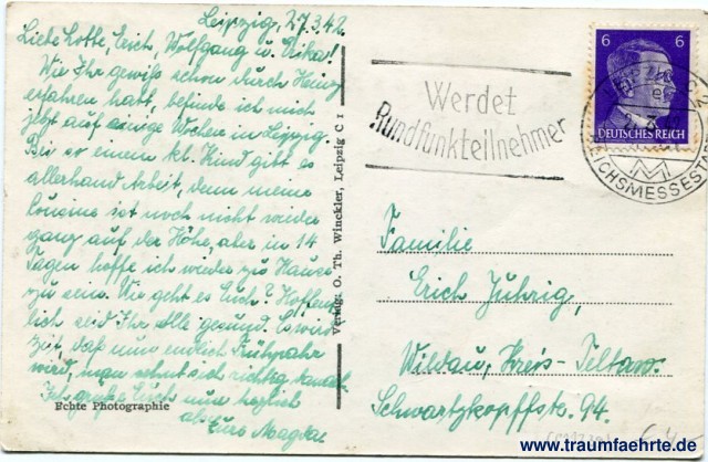 Stempel: Leipzig C 2, Reichsmessestadt, 27.3.42, (...), MM; Werdet Rundfunkteilnehmer