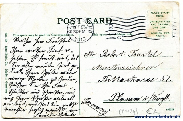 Beschriftung hinten: Post Card, This space may be useed for Correspondence. This space for Address only. Place stamp here. United States and Canada, one cent. Foreign two cents. S 6248, No. 38 Rinn Publ. Co. Made in Germany