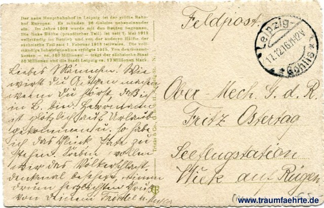 – Details – Year: 1915 Postal state: postally used without stamp (military mail), 1916 Inscription front: Leipzig. Der neue Hauptbahnhof. Inscription back: Der neue Hauptbahnhof in Leipzig ist der größte Bahnhof Europas. Es münden 26 Geleise nebeneinander ein. Im Jahre 1902 wurde mit den Bauten begonnen. Die linke Hälfte (preußischer Teil) ist seit 1. Mai 1912 vollständig in Betrieb und von der anderen Hälfte der sächsische Teil seit 1. Februar 1913 teilweise. Die vollständige Inbetriebnahme erfolgte 1915. Von den Gesamtkosten – ca. 150 Millionen – trägt der sächsische Staat 50 Millionen und die Stadt Leipzig ca. 17 Millionen Mark. T Co. Trinks & Co., G. m. b. H., Leipzig-St. Nr. 1. Postmark(s): Leipzig-Gohlis, 17.12.16.11-12V Please note: