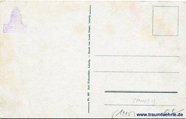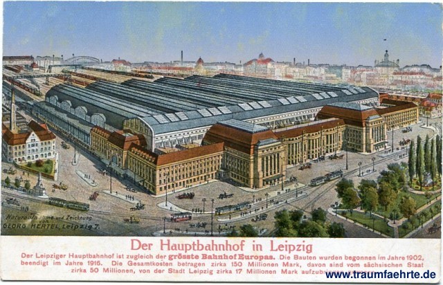 – Details – Jahr: ca. 1915 Status: ungelaufen Beschriftung vorne: Der neue Hauptbahnhof in Leipzig, Der Leipziger Hauptbahnhof ist zugleich der grösste Bahnhof Europas. Die Bauten wurden begonnen im Jahre 1902, beeidigt im Jahre 1916. Die Gesamtkosten betragen zirka 150 Millionen Mark, davon sind vom sächsischen Staat zirka 50 Millionen, von der Stadt Leipzig ca. 17 Millionen Mark aufzubringen gewesen. Naturaufnahme und Zeichnung von Georg Hertel, Leipzig 7. Beschriftung hinten: Nr. 897 Karl Fickenscher, Leipzig. – Druck von Louis Glaser, Leipzig Stempel: 1. Allgem. Deutscher Reichskrieger-Tag, Leipzig 17.-19. Okt. 1925 Hinweis: