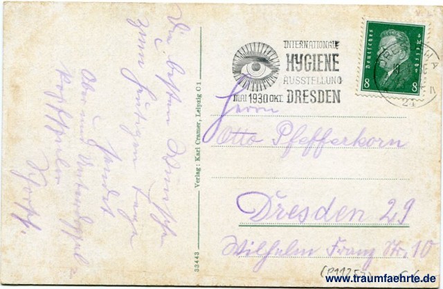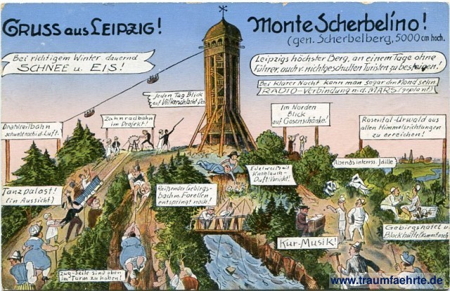 – Details – Jahr: ca. 1925 Status: gelaufen 1930 Beschriftung vorne: Gruss aus Leipzig! Monte Scherbelino! (gen. Scherbelberg, 5000 cm hoch. Bei richtigem Wetter dauernd Schnee u. Eis! Leipzigs höchster Berg, an einem Tage ohne Führer, auch v. nichtgeschulten Turisten zu besteigen! Bei klarer Nacht kann man sogar den Mond sehn. Radio-Verbindung n. d. Mars. (geplant.) Jeden Tag Blick auf Völkerschlacht De(...), Zahnradbahn im Projekt! Im Norden Blick auf Gänseschänke! Drahtseilbahn schwebt noch i. d. Luft. Rosental-Urwald aus allen Himmelsrichtungen zu erreichen! Tanzpalast! (in Aussicht) Reißender Gebirgsbach mit Forellen entspringt noch! Edelweiß mit Knoblauch-Duft! Vorsicht! Abends interess. Idille. Gebirgshotel u. Blockhütte (kommt noch, Kur-Musik! Zug-Seile sind oben im Turm zu haben! Beschriftung hinten: 33443 Verlag: Karl Cramer, Leipzig C 1 Stempel: Internationale Hygiene Ausstellung, Mai 1930 Okt, Dresden; Dresden A 24, 10 4 30 23-24 (...) Hinweis: