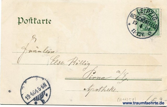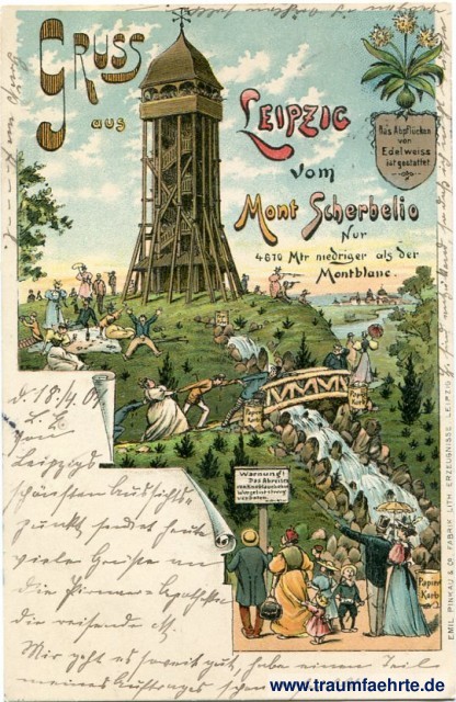 – Details – Jahr: ca. 1900 Status: gelaufen 1904 Beschriftung vorne: Gruss aus Leipzig vom Monte Scherbelino, Nur 4670 Mtr niedriger als der Montblanc. Das Abflücken von Edelweiss ist gestattet. Warnung! Das Abreissen von Knoblauch ohne Wurzel ist streng verboten. Emil Pinkau & Co Fabrik Lith. Erzeugnisse, Leipzig Papierkorb,... Beschriftung hinten: Postkarte. Stempel: Leipzig Neuschönefeld, * c, 19 4 04 11-12V.; (...), * b *, 19.4.04.5-6N Hinweis: