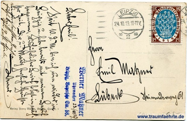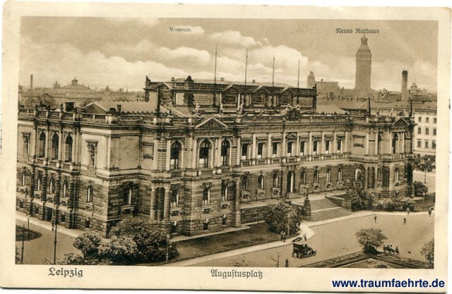 – Details – Jahr: ca. 1915 Status: gelaufen 1919 Beschriftung vorne: Leipzig, Augustusplatz, Museum, Neues Rathaus Beschriftung hinten: Verlag Franz Martin, Leipzig, Querstr. 1 Stempel: Werner Matzner, Uhrmacher, Leipzig, Bayerische Str. 58.; Leipzig, 8 2 8, 24.10.19. 10-11V.; --- Hinweis:
