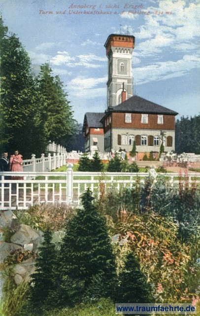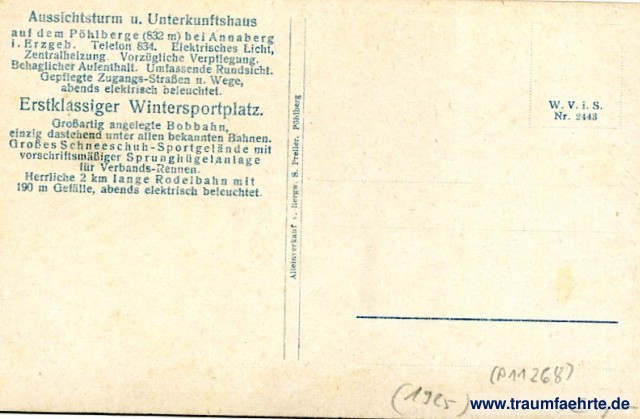 – Details – Jahr: ca. 1925 Status: ungelaufen Beschriftung vorne: Annaberg i. sächs. Erzgeb. Turm und Unterkunftshaus a. d. Pöhlberg (832 m). Beschriftung hinten: Aussichtsturm u. Unterkunftshaus auf dem Pöhlberg (832 m) bei Annaberg i. Erzgeb. Telefon 834. Elektrisches Licht, Zentralheizung. Vorzügliche Verpflegung. Behaglicher Aufenthalt. Umfassende Rundsicht. Gepflegte Zugangs-Straßen u. Wege, abends elektrisch beleuchtet. Erstklassiger Wintersportplatz. Großartig angelegte Bobbahn, einzig dastehend unter allen bekannten Bahnen. Großes Schneeschuh-Sportgelände mit vorschriftsmäßiger Sprunghügelanlage für Verbands-Rennen. Herrliche 2 km lange Rodelbahn mit 190 m Gefälle, abends elektrisch beleuchtet. W. V. i. S. Nr. 2443, Alleinverkauf v. Bergw. S. Preller, Pöhlberg Stempel: keine Hinweis: