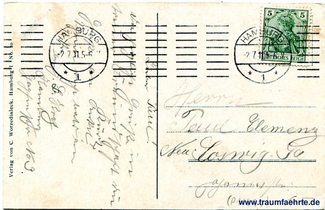 – Details – Jahr: ca. 1910 Status: gelaufen 1911 Beschriftung vorne: Hamburg. Hafen. Beschriftung hinten: Verlag von C. Worzedialeck. Hamburg I No. 20 Stempel: 2x Hamburg, * 1 *, -2.7.11.5-6 V; --- Hinweis: