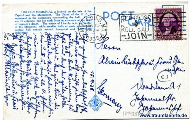 – Details – Year: ca. 1935 Postal state: postally used 1938 Inscription front: Lincoln Memorial and Mirror Pool, Washington D.C. 60369 Inscription back: Post Car(d), (...), Licon Memorial is located on the axis of the Capitol and the Monument. The Union of the U.S. is expressed in the colonnade surrounding the hall. There are 36 columns, one for each State in existence at the time of Lincoln's death. The statue of Lincoln is in the center of the Memorial , while smaller halls at each side of the central hall contain second Inaugural and Gettysburg Addresses. UN CO, trade mark registered Postmark(s): Saint Louis, Nov 15, 6 – pm, 1938; Red Cross, +, Roll Call, – Join - Please note: