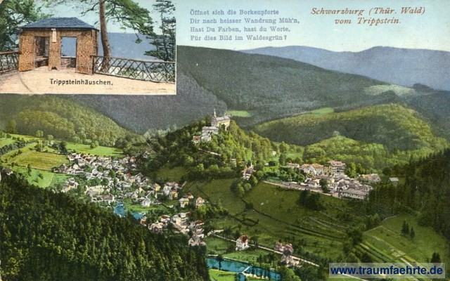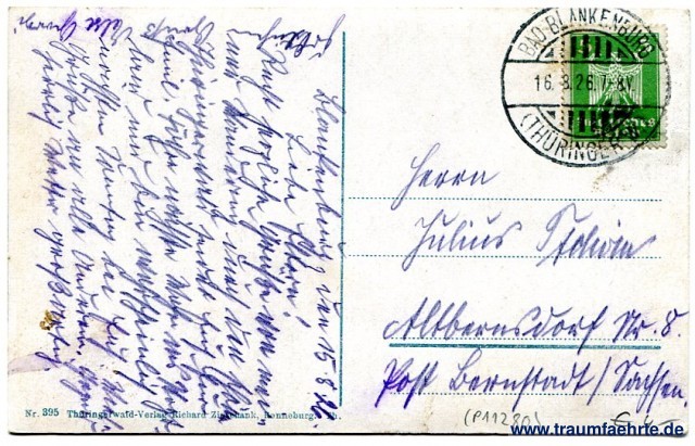 – Details – Jahr: ca. 1925 Status: gelaufen 1926 Beschriftung vorne: Schwarzburg (Thür. Wald) vom Trippstein. Öffnet sich die Borkenpforte / Dir nach heisser Wandrung Müh'n, / Hast Du Farben, hast du Worte, / Für dies Bild im Waldesgrün? Trippsteinhäuschen. Beschriftung hinten: Nr. 395 Thüringerwald-Verlag Richard Zieschank, Ronneburg. Th. Stempel: Bad Blankenburg (Thüringen), 16.8.26. 7-8V Hinweis: