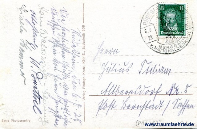 Postmark(s): Rüdesheim (Rhein), Bergbahn z. Nationaldenkmal, 6. 8. 28, 15-16