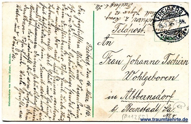 – Details – Jahr: ca. 1915 Status: gelaufen ohne Briefmarke (Feldpost), 1916 Beschriftung vorne: Freiberg. Partie im Albertpark Beschriftung hinten: Heliocolorkarte von Ottmar Zieher, München. Z [2260] Stempel: Freiberg (Sachsen), 2, 16.3.16. 7-8N Hinweis: