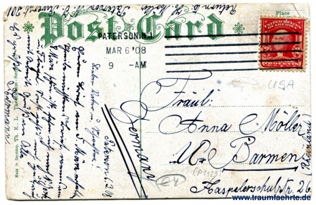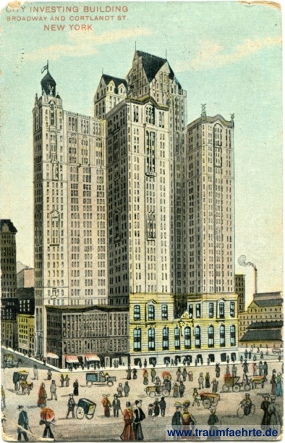 – Details – Jahr: ca. 1905 Status: gelaufen 1908 Beschriftung vorne: City Investing Building, Broadway and Courtland St. New York Beschriftung hinten: Post Card, Place (stamp here...), Made in Germany. Th. E. L. Theochrom-Series, 162 Stempel: Patterson, Mar 6 '08, 9 -am; --- Hinweis: