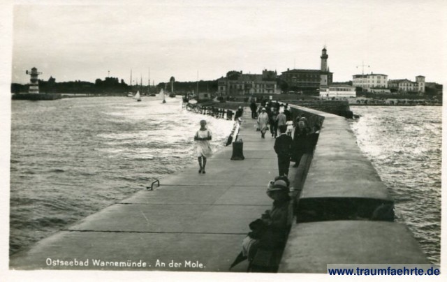 – Details – Year: ca. 1940 Postal state: postally unused Inscription front: Ostseebad Warnemünde. An der Mole. Inscription back: Julius Simonsen, echte Photographie, Oldenburg i. Holstein, 32667 Postmark(s): none Please note: