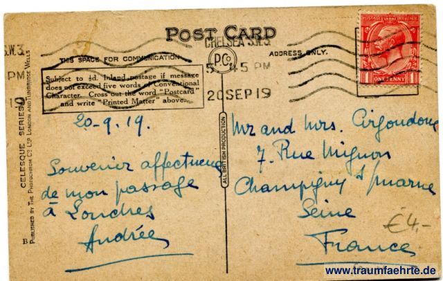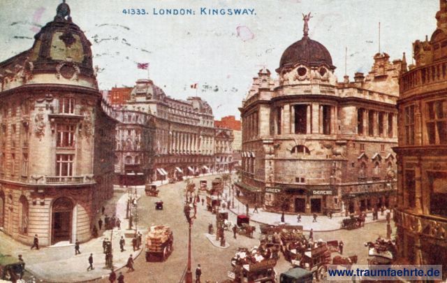 – Details – Jahr: ca. 1910 Status: gelaufen 1919 Beschriftung vorne: 41333. London: Kingsway. Beschriftung hinten: Post Card, P.Co. This space for communication, address onky. Subject to ½d. Inland postage if message does not exceed five words of Conventional Character. Cross out the word Postcard and write Printed Matter above. Celesque Series, Published by The Photochrom Co Ltd London and Tunbridge Wells, B, All British Production Stempel: 2x Chelsea S.W. 3. 5. 45 pm, 20Sep19; 2x ~~~ Hinweis: