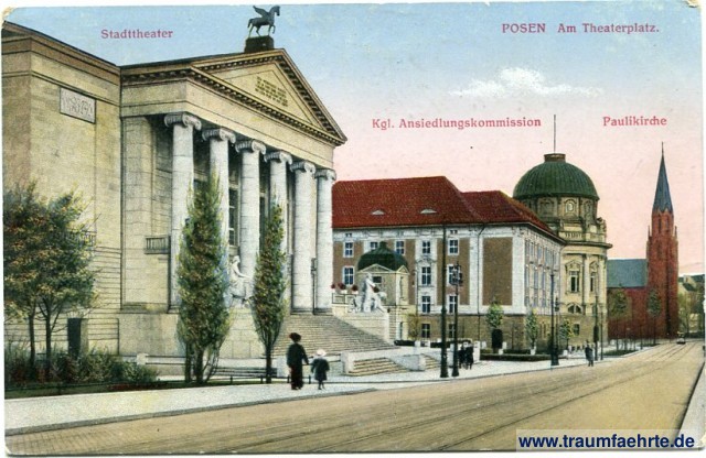 Beschriftung vorne: Posen, Am Theaterplatz. Stadttheater, Kgl. Ansiedlungskommission, Paulikirche