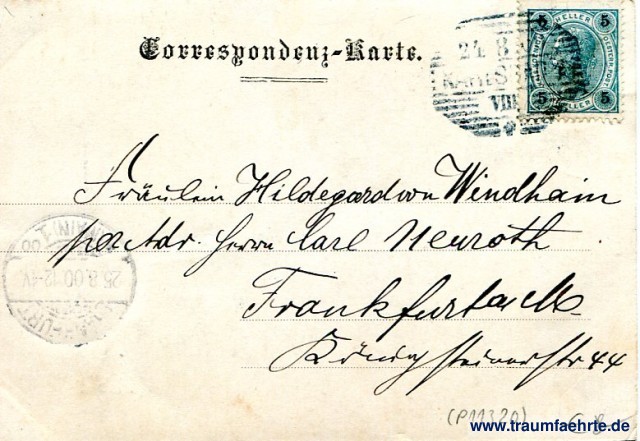 – Details – Year: ca. 1895 Postal state: postally used 1900 Inscription front: Karlsbad, H. de Witte, Karlsbad Inscription back: Correspondenz-Karte. Postmark(s): 24.8.00, Karlsbad, VIII; Frankfurt (Main) 1, 25.8.00 12-1V. [00] Please note: