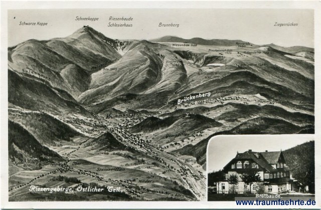 Ansichtskarte Brotbaude / Chlebowa Buda in Krummhübel / Karpacz inkl. Brückenberg, Wolfshau [ Permalink ]Schlagworte: Riesengebirge, Schlesien, Ostgebiete, Panorama, Gebirge, Berge, Bauden