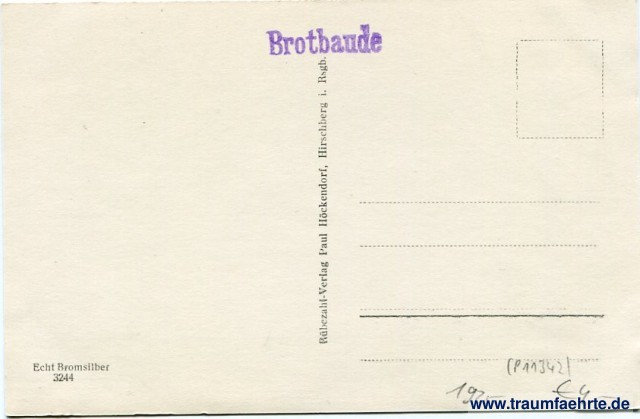 – Details – Jahr: ca. 1925 Status: ungelaufen Beschriftung vorne: Riesengebirge, Östlicher Teil, Brotbaude. Schwarze Koppe, Schneekoppe, Riesenbaude Schlesierhaus, Brunnberg, Ziegenrücken, Wiesenbde. 1400, Prinz Heinrich Bde. 1423, Rennerbde 1450, Mittagsteine 1425, Eulengrund, Melaer Grund Bde. 1003, Gehängeweg, Hampelbde. 1258, Schlingelbde. 1067, Kl. Teich, Gr. Teich, Dreisteine 1204, Teichmann Bde. 804, Hoserweg, n. Forstbauden, Wolfshau, Krummhübel, Brückenberg, Kirche Wang 874, Brotbaude, Baberhaus, Querseiffen, Pfaffenbg. Kaiser Friedrich Bde., Ober-, Steinseiffen, Nieder-, Lommitz, Birkig Beschriftung hinten: Rübezahl-Verlag Paul Höckendorf, Hirschberg i. Rsgb. Echt Bromsilber 3244 Stempel: Brotbaude Hinweis: