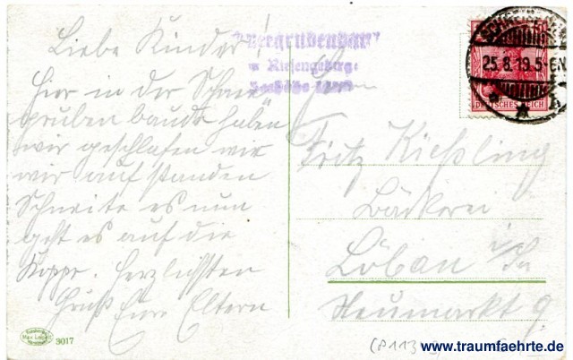 – Details – Jahr: ca. 1915 Status: gelaufen 1919 Beschriftung vorne: Riesengebirge. Die Schneegrube und Baude 1490 m über dem Meer. Beschriftung hinten: Kunstverlag Max Leipelt, Warmbrunn, 3017 Stempel: [Schneegrubenbaude] im Riesengebirge [...]; Schnee[...], 25. 8. 19.5-6N, *** Hinweis: