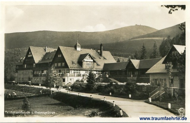 – Details – Year: ca. 1925 Postal state: postally unused Inscription front: Teichmannbaude i. Riesengebirge, Silesia, 25 Inscription back: Riesengebirge. Krummhübel. Die Teichmannbaude 843 m. ü. d. M. Original Photoabzug, E. Wagner Söhne, Zittau i. Sa. Silesia-Verlag Postmark(s): Berghotel Teichmannbaude, [...]höhe 543 m. Brückenberg i/Rsgb Please note: