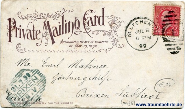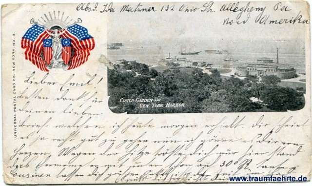 – Details – Jahr: ca. 1895 Status: gelaufen 1899 Beschriftung vorne: Castle Garden and New York Harbor. Universal Post Card Co. New York. No. 3. Beschriftung hinten: Private Mailing Card, Authorized by Act of Congress of May 19, 1898, This side is exclusively for the address Stempel: Allechen[...], Jul 8 99, 5 pm; Brixen, 21.7.99, 6.V Hinweis: