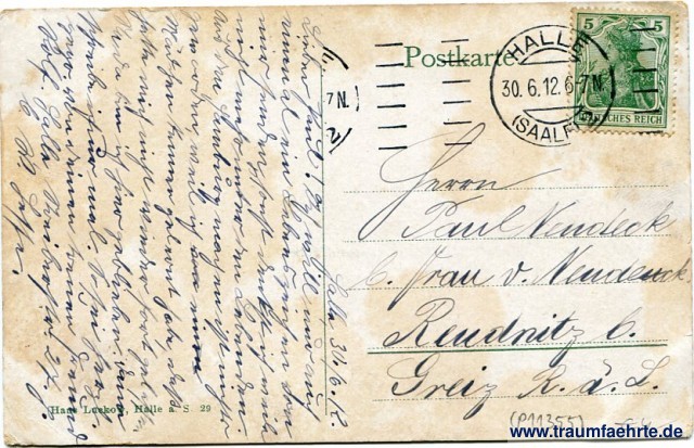 – Details – Jahr: ca. 1910 Status: gelaufen 1912 Beschriftung vorne: Halle a. S. Ein Blick von der Burgruine Giebichenstein Beschriftung hinten: Postkarte, Hans Luckow, Halle a. S. 29 Stempel: 1½x Halle (Saale), 30.6.12. 6-7N; --- Hinweis: