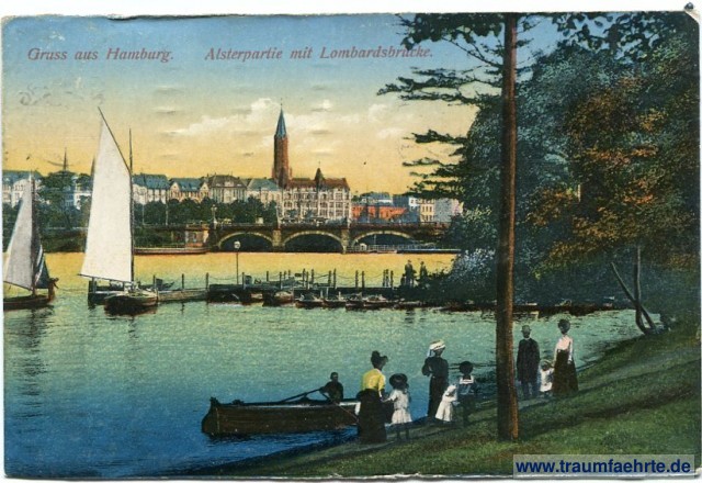 coloured – Alster river with landing place, sailing ships, boats and Lombardsbrücke bridge, riverside with boat, trees and pedestrians on the right, buildings and tower of church of Hamburg in the background