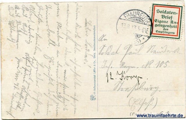 – Details – Jahr: ca. 1910 Status: gelaufen 1913 (Feldpost) Beschriftung vorne: Turnhalle des Turnvereins Fraureuth, e. V. Beschriftung hinten: [...] Co. G ab. Hofkunstanstalt Löffler & Co., Greiz. Geschmacksmusterschutz Stempel: Fraureuth [...]s) *, 12.8.13.5-6V Hinweis: