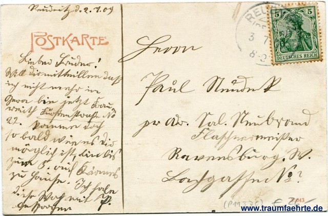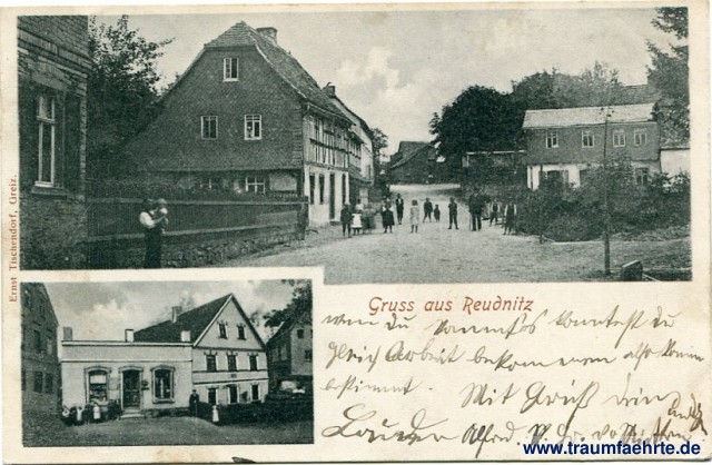 – Details – Year: ca. 1905 Postal state: postally used 1909 Inscription front: Gruss aus Reudnitz, Ernst Tischendorf, Greiz. Inscription back: Postkarte, 31043 Postmark(s): Reudnitz, [...] 3 7 09, 8-9 Please note: