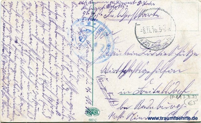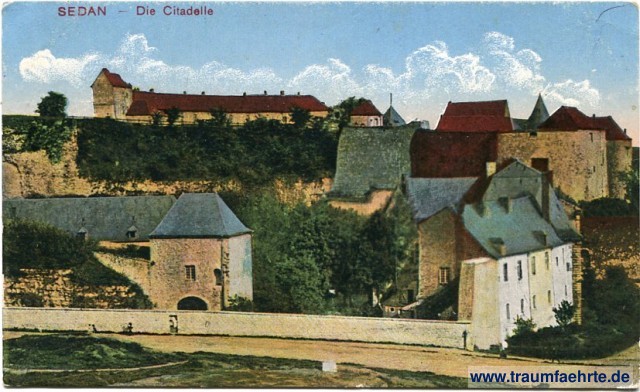 – Details – Jahr: ca. 1915 Status: gelaufen ohne Briefmarke (Feldpost), 1916 Beschriftung vorne: Sedan – Die Citadelle Beschriftung hinten: GWD Graphische Werke G.m.b.H. Dresden, 687 C Stempel: [...] d. 221 Infanterie-Div, -8.11.16.5-6N; Briefstempel, Feldartillerie-Regiment, 3. Battailon Hinweis: