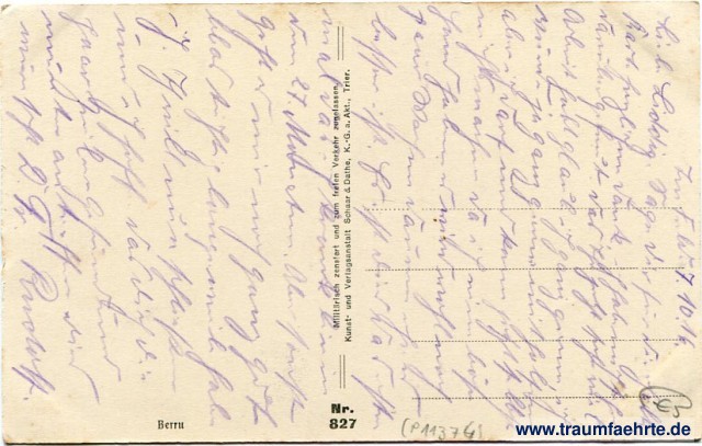 Beschriftung hinten: Berru, Nr. 827, Militärisch zensiert und zum freien Verkehr zugelassen. Kunst- und Verlagsanstalt Schaar & Dathe, K.-G. a. Akt., Trier.