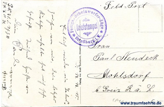 – Details – Year: ca. 1915 Postal state: postally used without stamp (military mail), dated 14.12.15 Inscription front: Strassburg, Altes Schloss und Münster Inscription back: Verlag von Emil Hartmann, Strassburg i. E. Postmark(s): Briefstempel, Festgs.-Scheinwerfer-Züge, Straßburg i. E. Please note: