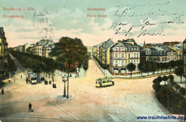 – Details – Jahr: ca. 1910 Status: gelaufen 1911 Beschriftung vorne: Straßburg i. Els. Strasbourg, Brantplatz, Place Brant Beschriftung hinten: Postkarte An ... in ... Mitteilungen, Verlag Viktor's Kunstverlag, A. Freyer, Strassburg i. Els. Stempel: Strassburg (Els.) 2, 23.5.11 10-11N Hinweis: