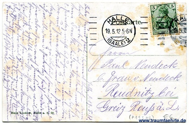 – Details – Jahr: ca. 1910 Status: gelaufen 1912 Beschriftung vorne: Halle a. S. Saalepartie bei Cröllwitz. Beschriftung hinten: Postkarte. Hans Luckow, Halle a. S. 20 Stempel: 1½x Halle (Saale) 2, 19.5.12 5-6 Hinweis: