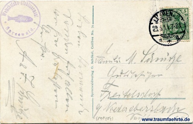 – Details – Jahr: ca. 1910 Status: gelaufen 1911 Beschriftung vorne: Spreewald, Partie bei Lübbenau. Beschriftung hinten: Spreewaldverlag Otto Schökel, Cottbus. Nr. 74 Stempel: Lübbenau, * * a, 23. 5.11 7-8N; Wetschofska-Etablissement, Spreewald Hinweis: