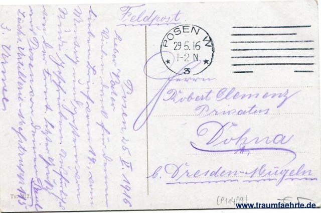 – Details – Jahr: ca. 1915 Status: gelaufen ohne Briefmarke (Feldpost), 1916 Beschriftung vorne: Posen. Königl. Residenzschloß. Beschriftung hinten: Tx. 212. Stempel: Posen W, * 3 *, 29 5. 16, 1-2 N; --- Hinweis: